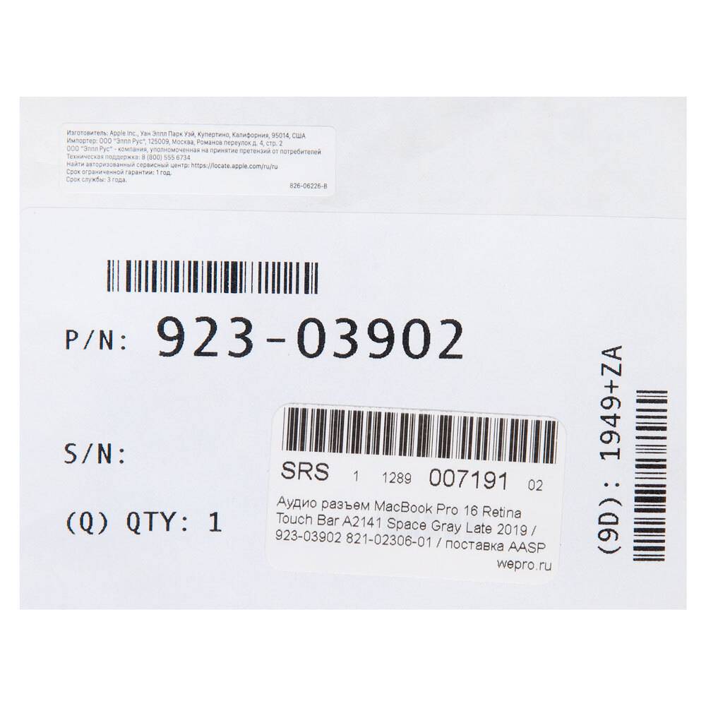 Аудио разъем MacBook Pro 16 Retina Touch Bar A2141 Space Gray Late 2019 / 923-03902 821-02306-01 / поставка AASP