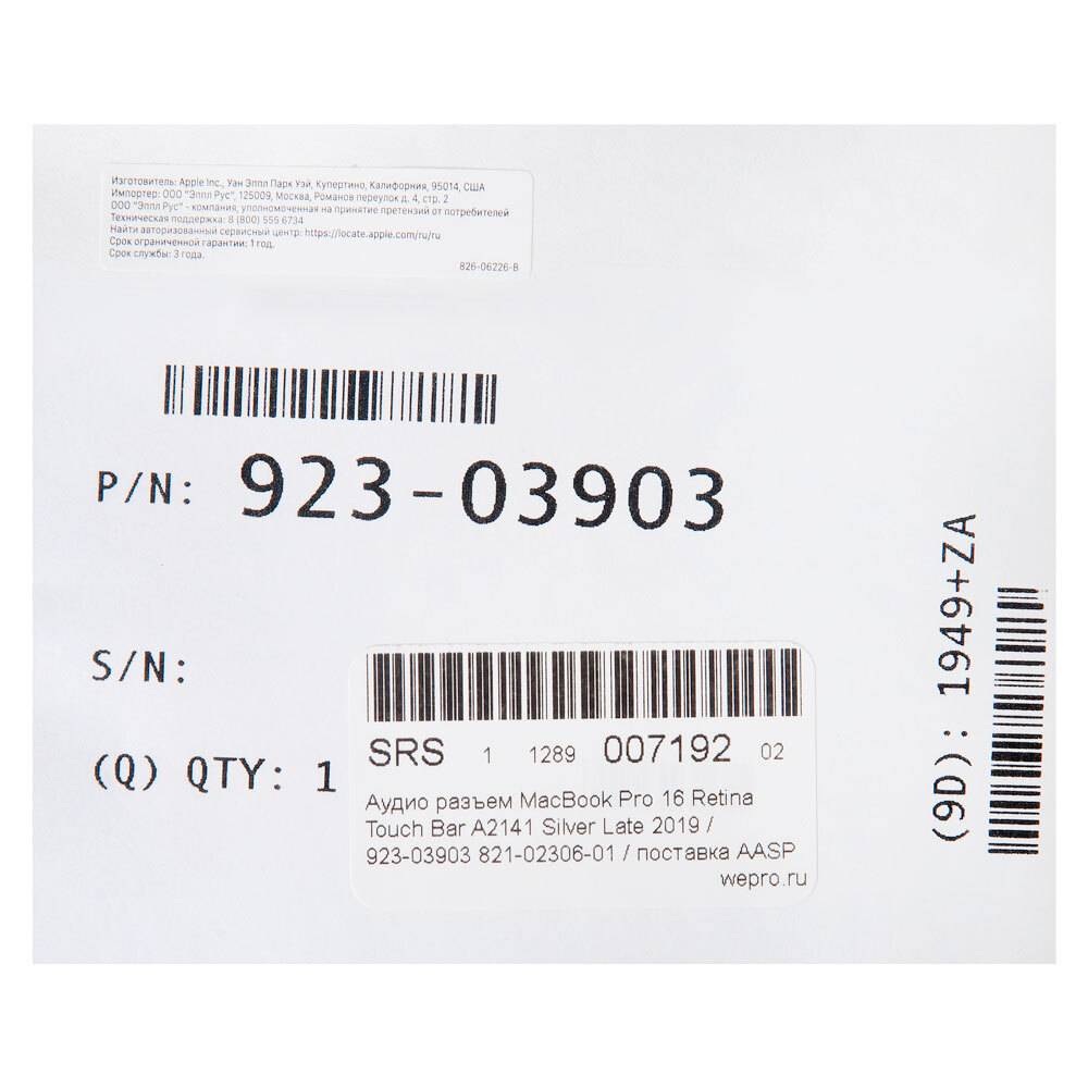 Аудио разъем MacBook Pro 16 Retina Touch Bar A2141 Silver Late 2019 / 923-03903 821-02306-01 / поставка AASP